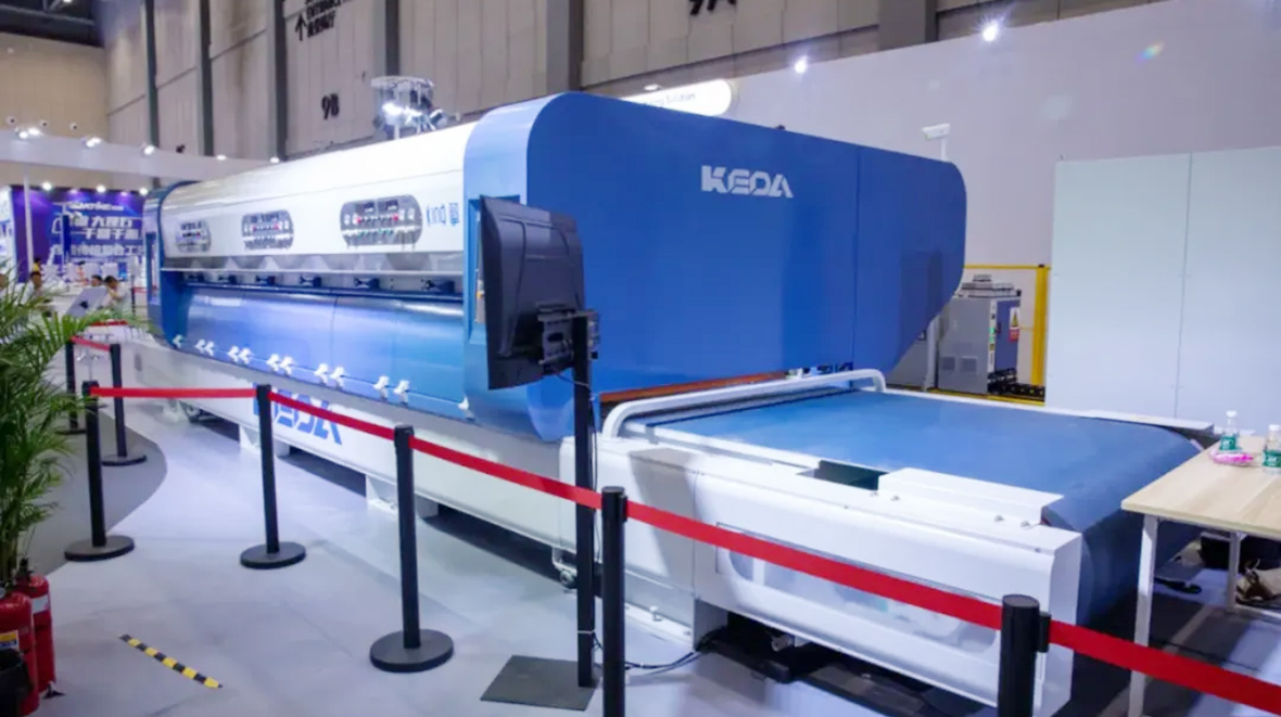 科達的新一代擎系列高效智能磨邊機,其工作寬度涵蓋150-3600mm,磚坯加工厚度從3mm到40mm;推磚速度超過了100片/分鐘,對角線誤差≤0.3mm(以400×800mm為例);還應用了集成磨削量測量、AI算法技術及直驅節電技術,使得磨邊精度高,產品優等率達99.7%以上。