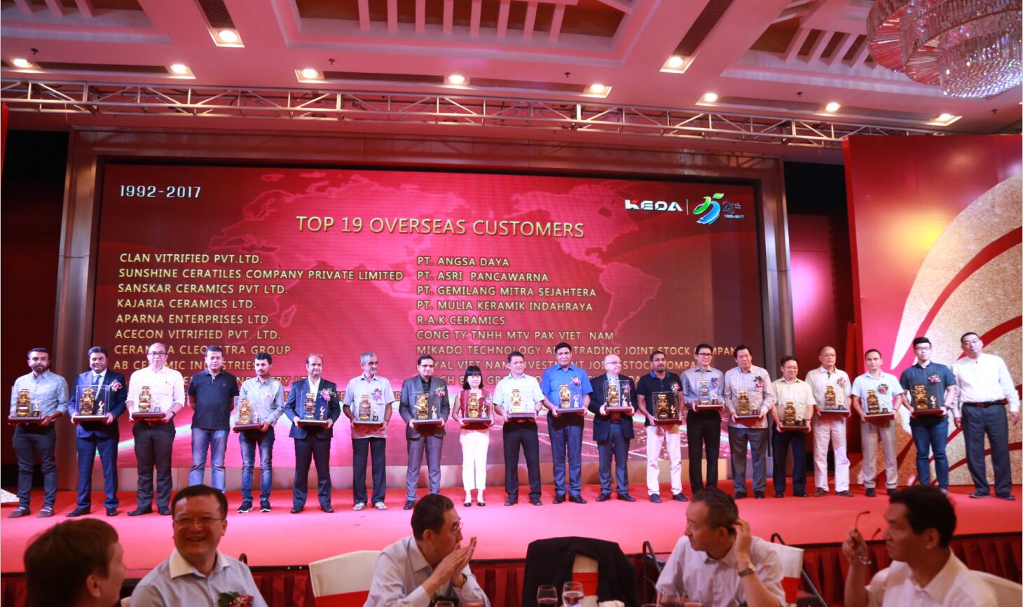 公司董事長邊程,總裁吳木海攜公司領導團隊向客戶祝酒致謝,吳總致祝酒詞:“今年恰逢科達成立25周年,25年來,科達秉持特有的創新基因,一直努力為做好整線陶瓷機械裝備不懈努力,今天在展會現場我們看到了類似數字磨邊機、T-BOX儲坯系統、還有3D打印機等非常多的亮點,今后我們仍然會堅持不懈創新,繼續努力做精做強,助力陶瓷行業的轉型升級,大家共同為陶瓷行業的再次騰飛舉杯!”
