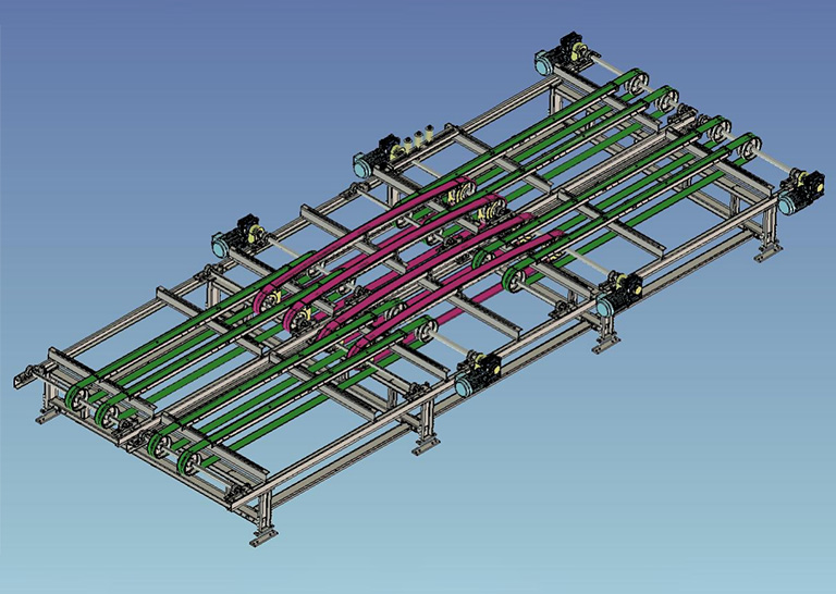8米雙傳動轉向線上兩臺獨立線架由雙拼線架腳連接成一體,通過拱形轉向皮帶的速度差帶動瓷磚完成90度調頭轉向,方便、快捷。 適用于規格800x1600以上的產品。