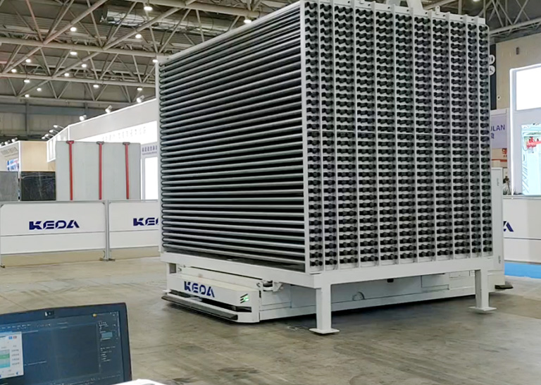 為了解決不同品種瓷磚混存的問題,科達針對需要頻繁轉換瓷磚花色品種的柔性生產需求,提出了柔性儲坯模式的概念。此種模式下,整個轉產過程不需要人來控制儲坯器將轉產前品種全部清空,層架式儲坯器依然按照先進先出的原則出磚,逐漸將轉產前品種替換為轉產后品種瓷磚。視覺分檢系統將轉產過程中混燒的產品進行區分。兩種產品由不同下磚機進行下磚,再由儲磚系統存放至不同軌道。整個轉產過程無需人工分檢且不會產生空檔期。此外,可根據不同的作業環境,選用直聯或斷開模式。實現空間最大利用率和周轉率。