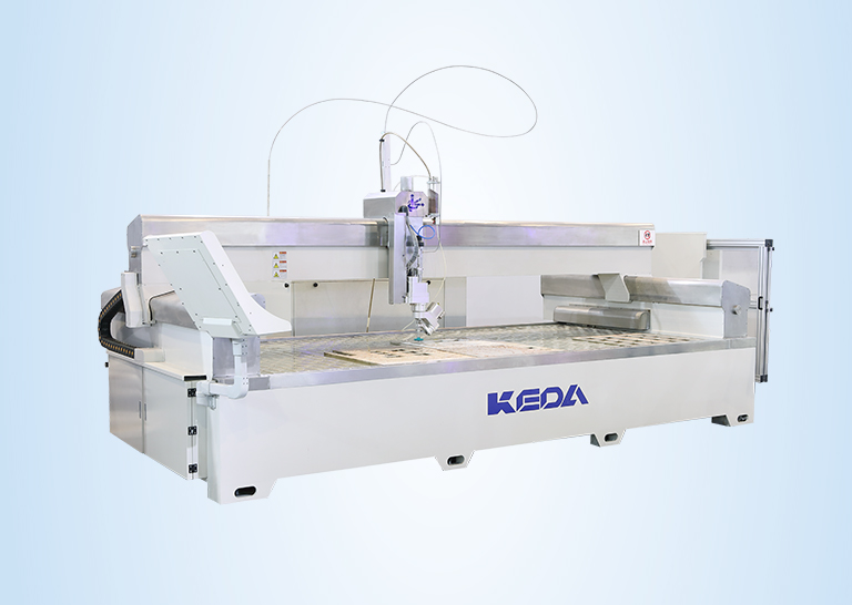 科達 CW 系列水刀最大加工工件規格為 2000X4000mm,可對巖板、石材等材料實現全自動,任意方向多軸聯動切割,異形 零件的一次成型, 同時解決傳統水切割切縫錐度誤差、表面條紋及轉角處的裙擺誤差等缺陷。
