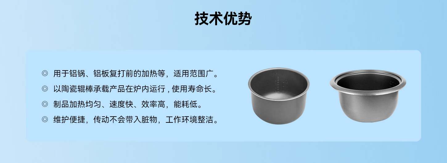 ◎ 用于鋁鍋、鋁板復(fù)打前的加熱等,適用范圍廣。 ◎ 以陶瓷輥棒承載產(chǎn)品在爐內(nèi)運(yùn)行 , 使用壽命長(zhǎng)。 ◎ 制品加熱均勻、速度快、效率高,能耗低。 ◎ 維護(hù)便捷,傳動(dòng)不會(huì)帶入臟物,工作環(huán)境整潔。